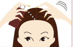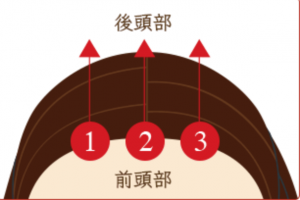 STEP2 ライン毎に前頭部から後頭部にかけて3箇所に各2プッシュ塗布し馴染ませてください